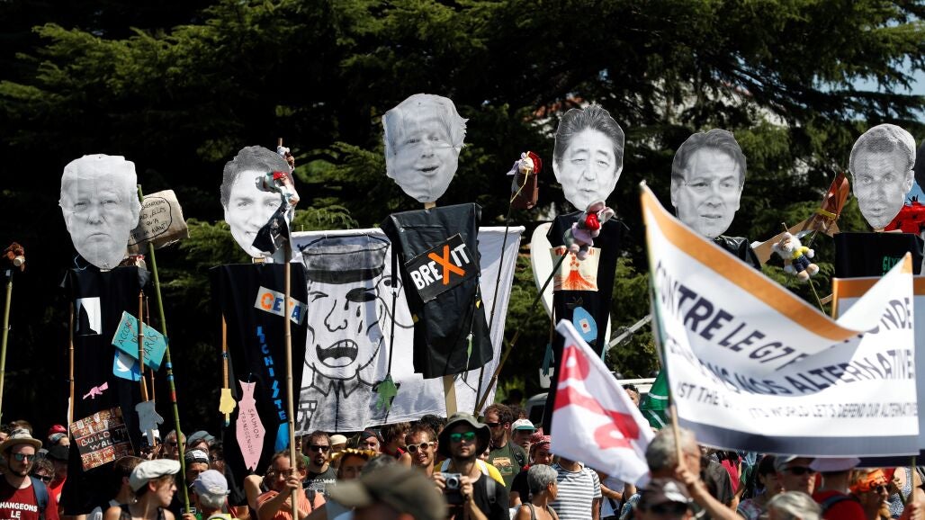 Los manifestantes protestan contra la Cumbre del G7, que se celebra estos días en la localidad vecina de Biarritz. Con una pancarta que lleva el lema 'No al G7, construyendo otro mundo desde Euskal Herria' miles de personas han iniciado una mrcha desde el puerto francés de Hendaya.