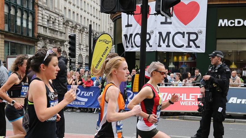 Decenas de miles de personas participaron este domingo, rodeados de fuertes medidas de seguridad, en la Gran Carrera de Mánchester, el primer evento multitudinario celebrado en esta ciudad inglesa desde el atentado terrorista del pasado lunes.