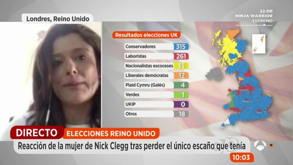 La colaboradora de Espejo Público y mujer del político liberal británico Nick Clegg, Miriam González, ha explicado en primer lugar que su marido ha perdido su escaño en las elecciones de Reino Unido, "algo que siento en el alma porque sé el sacrificio personal que ha hecho durante todos estos años", y asegura que "se va con la satisfacción de haberse ido luchando hasta el final por las ideas en las que cree y por la pertenencia del Reino Unido en la Unión Europea".