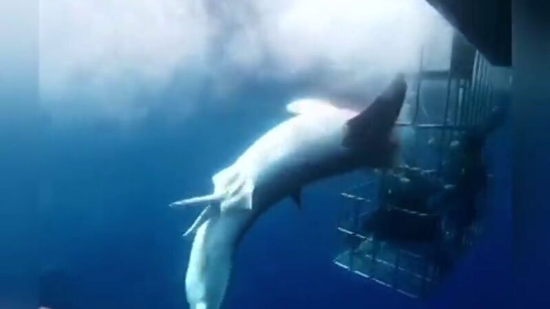Los hechos ocurrieron el 6 de diciembre cuando un grupo de turistas se sumergieron en aguas del Pacífico, más concretamente en la isla Guadalupe, en México, cuando un ejemplar de tiburón blanco quedó atrapado en la estructura e intento liberarse sin éxito. Durante 25 minutos permaneció con la cabeza atrapado desangrándose mientras los turistas les miraban y el animal acabó muriendo.