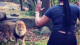 Una mujer se cuela en la zona de leones para bailar frente a estos en el zoo de Nueva York
