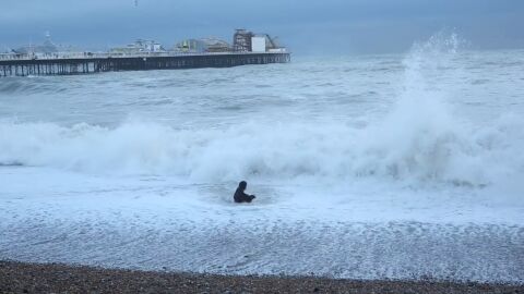 Una mujer fue captada lanzándose a las aguas heladas de Brighton, Reino Unido, para salvar a su perro. La fuerte marea y las altas olas casi acaban con su vida.