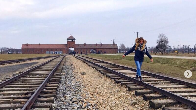 Además, acompaña el mensaje de cuatro fotografías en las que se puede observar a visitantes posando mientras hacen equilibrio sobre las vías de los trenes por las que llegaban al campo de exterminio nazi cientos de miles de personas para ser asesinadas.