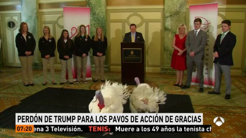 La Federación Nacional del Pavo pagará la factura del hotel, según la residencia presidencial. Trump perdonará la vida a los dos pavos este martes, cuando se divulgarán sus nombres, antes de la celebración de Día de Acción de Gracias el jueves. Esa ceremonia ilustra el papel central que el pavo tiene en la festividad de Acción de Gracias, cuando casi el 88 % de los estadounidenses come carne de ese tipo de ave, según la Federación Nacional del Pavo.