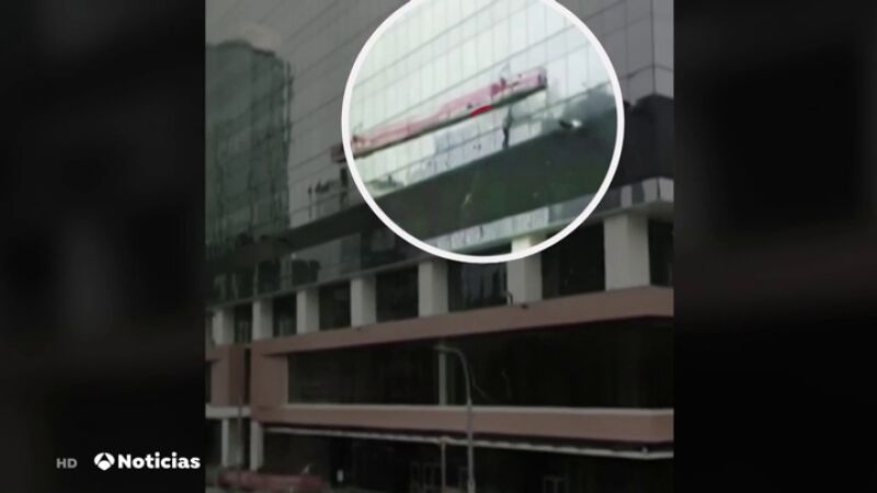 Este movimiento provocó que el hombre cayese al vacío, pero el arnés de seguridad le mantuvo sujeto a la estructura y le salvó la vida.