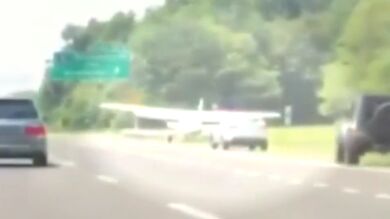 Un pequeño avión aterriza en medio del tráfico de una carretera en Long Island