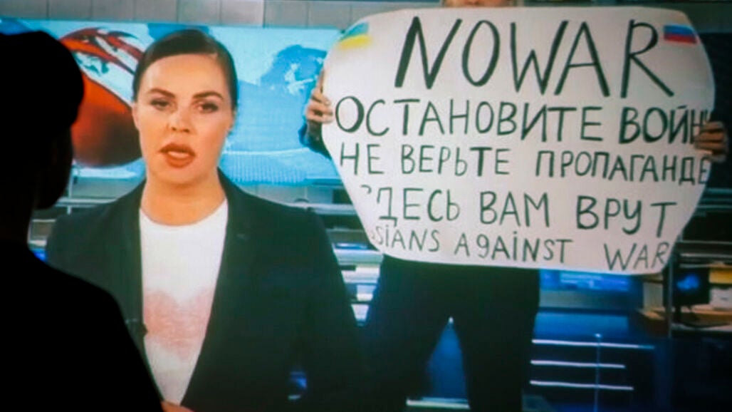 Maria Ovsyannikova, periodista del 'Canal 1' de la televisión rusa, irrumpió en directo y en pleno informativo en el plató de su programa con una pancarta en la que se leía "no crean en la propaganda".