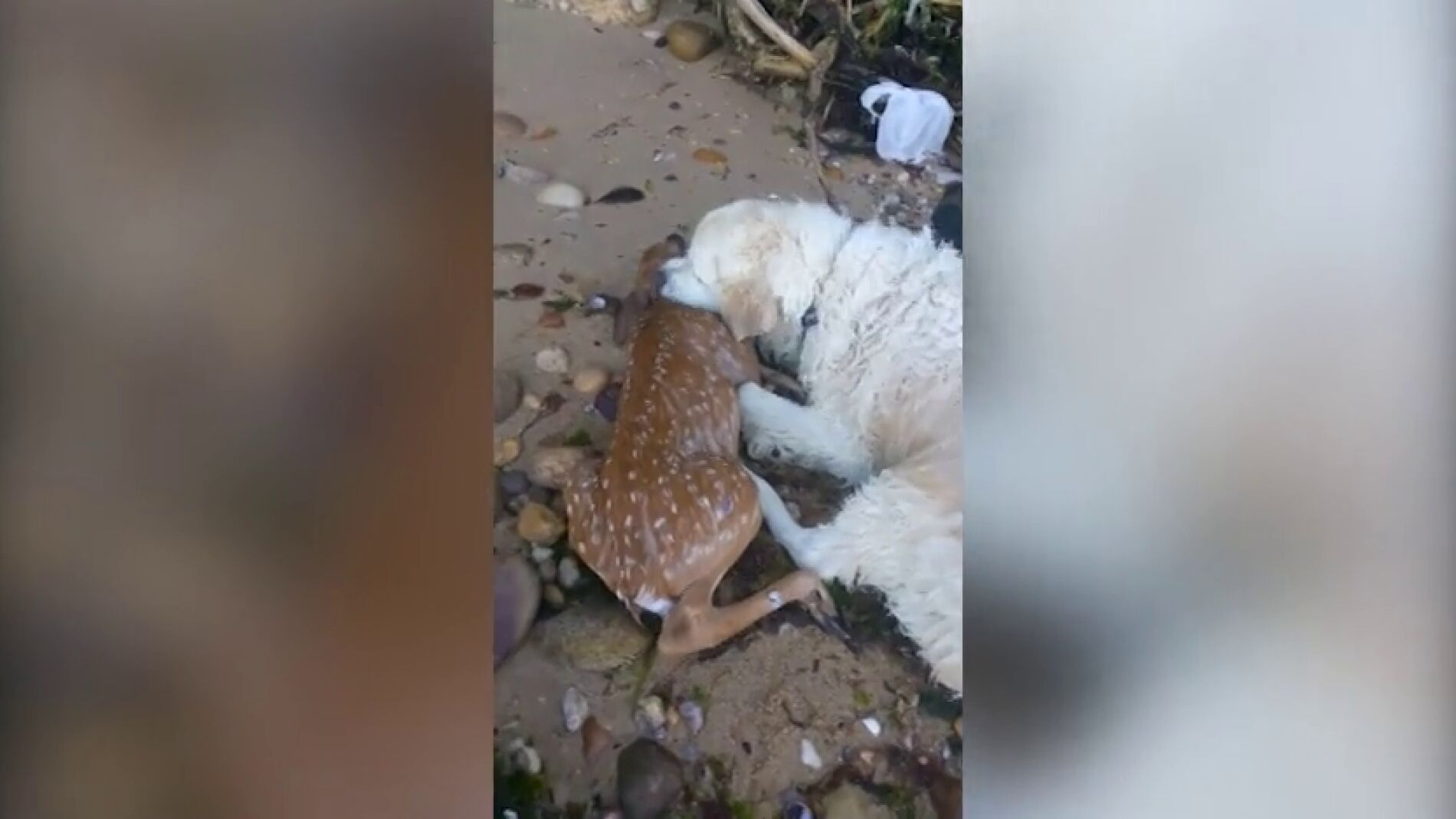Un perro consigue salvar la vida de un cervatillo que se estaba ahogando en el río