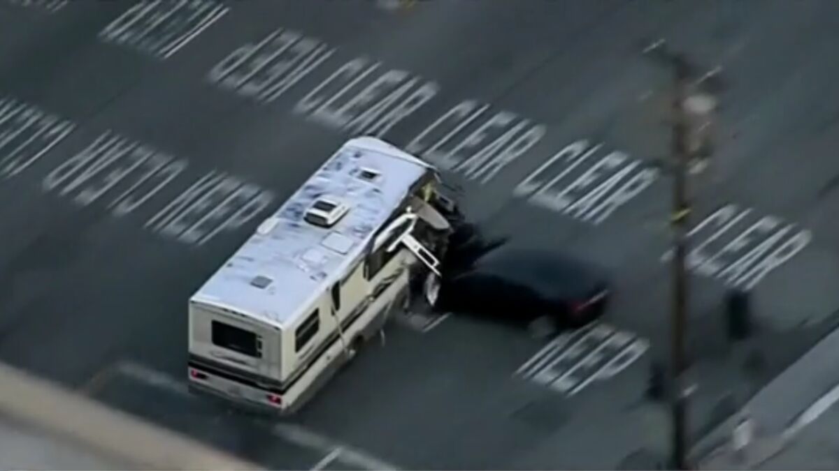 La policía de California (Estados Unidos) ha protagonizado una persecución a una autocaravana que había sido robada. Durante su huida fue golpeando a varios vehículos hasta que acabó chocando contra unos árboles.
