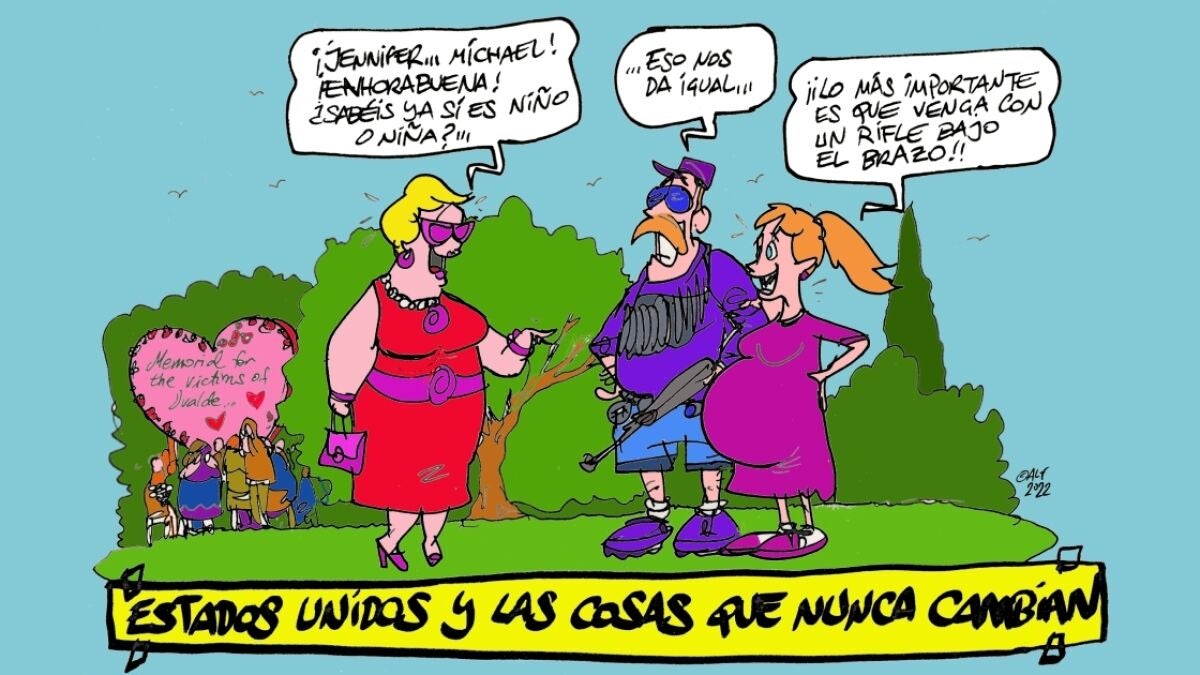 Alfredo Boto-Hervás ha querido reflejar esta dura realidad en su viñeta gráfica de la semana. En ella ilustra a un matrimonio estadounidense a punto de tener un hijo que 'asegura': "Lo más importante es que venga con un rifle debajo del brazo".