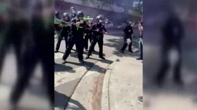 Los oficiales utilizaron bastones y escopetas antidisturbios, según se ve en las imágenes. En algunas de ellas se muestra a un agente que dispara a corta distancia una bala a una mujer. Esta le pedía que bajara el fusil. También se ve cómo los agentes golpean con porras a los participantes de la protesta.