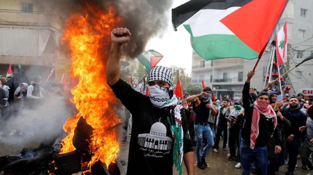 "Pedimos al Gobierno libanés y a los estados árabes que cesen todos sus programas de cooperación con Estados Unidos y expulse a sus embajadores, porque ese país es el presidente del terrorismo global y es el enemigo de Palestinay de todas las naciones que luchan por su libertad", ha añadido. Los manifestantes han bloqueado durante horas la principal carretera hacia la Embajada, situada en el barrio de Awkar, en el norte de la capital, donde han quemado neumáticos y banderas israelíes y estadounidenses.