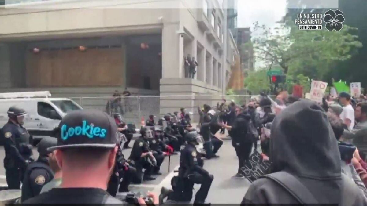 Una de las imágenes de reivindicación que está dando la vuelta al mundo está siendo la de los policías de Portland con una rodilla en el suelo como símbolo de protesta contra la muerte de Floyd.