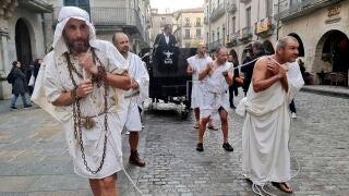 Policías municipales de Girona protestan vestidos de esclavos y siendo 'azotados' por la vara del alcalde