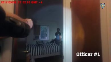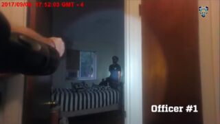 Durante 15 minutos, los oficiales le alientan en repetidas ocasiones a que suelte el cuchillo, además de sospechar que podría poseer un arma en la otra mano. Sin embargo, el hombre Miguel Richards permanece en silencio y quieto en un rincón de su habitación.
