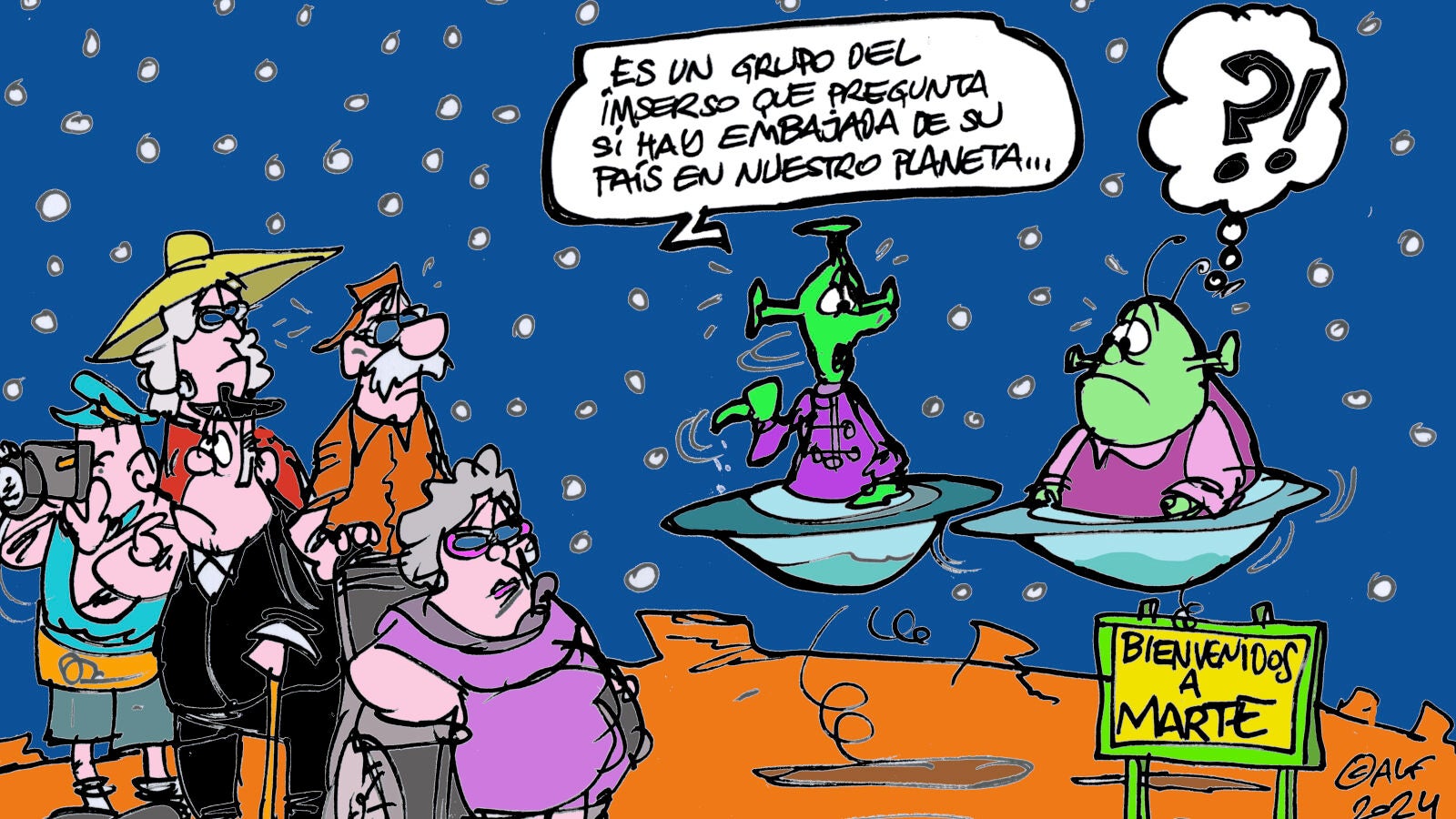 'Bienvenidos a Marte' reza el cartel de la viñeta gráfica de esta semana. En ella también aparecen dos extraterrestres hablando entre ellos. "Es un grupo del Imserso que pregunta si hay embajada de su país en nuestro planeta", le dice uno a otro, montados en su nave.
