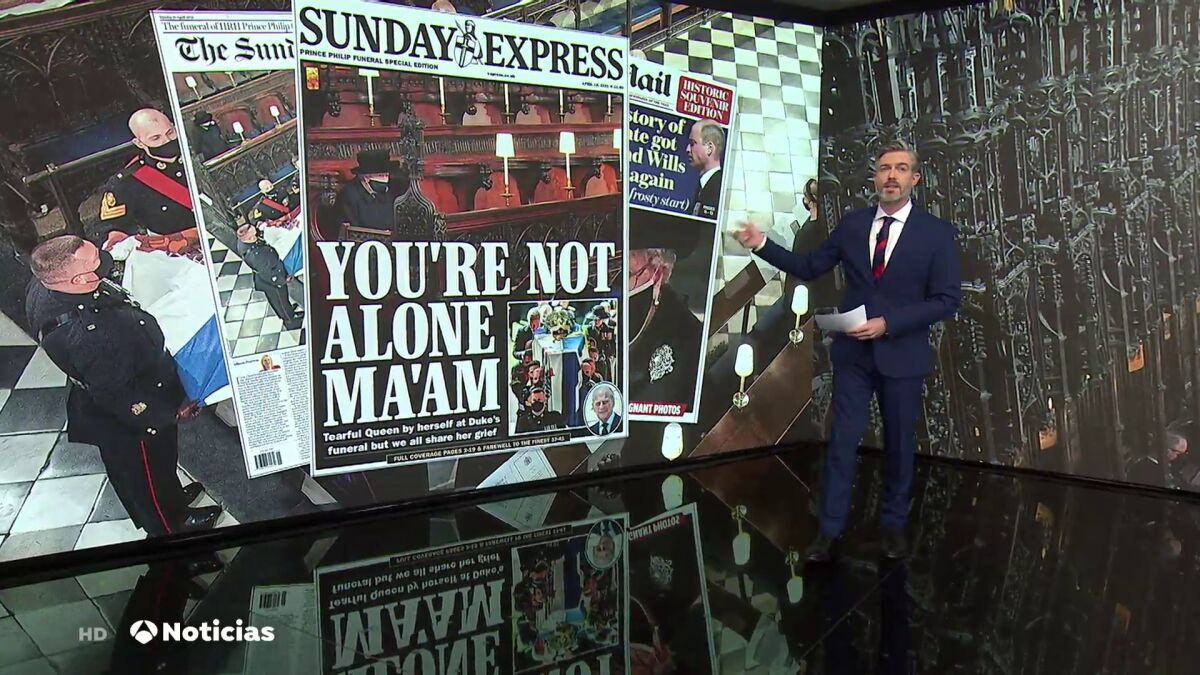 La bandera vuelve a izarse en el Reino Unido. Ha terminado el luto oficial que se decretó por la muerte de Felipe de Edimburgo. En el caso de la reina, seguirá vistiendo de negro al menos un mes. Isabel II es la protagonista de las portadas de hoy en el Reino Unido, con titulares dirigidos directamente a ella, como el del 'Sunday Express: "No está sola, majestad". Esto contrasta con la imagen más difundida del funeral. Pero muchos medios leen más allá, en los gestos de la familia real y sobre todo en el acercamiento entre los hijos del príncipe de Gales
