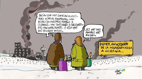 La viñeta gráfica de esta semana de Alfredo Boto se ha centrado en este tema. En la imagen se puede ver a dos personas hablando, mientras miran hacia una Ucrania destruida. "Decían que nos querían mucho, pero mira el panorama. Han destruido nuestros pueblos y ciudades. Han torturado y asesinado, nos han arruinado... y eso que nos quieren mucho", dice uno. La otra persona, a su lado, le responde: "Es que hay amores que matan".