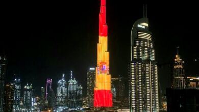 La bandera española iluminó los 830 metros de altura del edificio más alto del mundo, situado en Dubai, mientras España celebraba el día de la Fiesta Nacional.