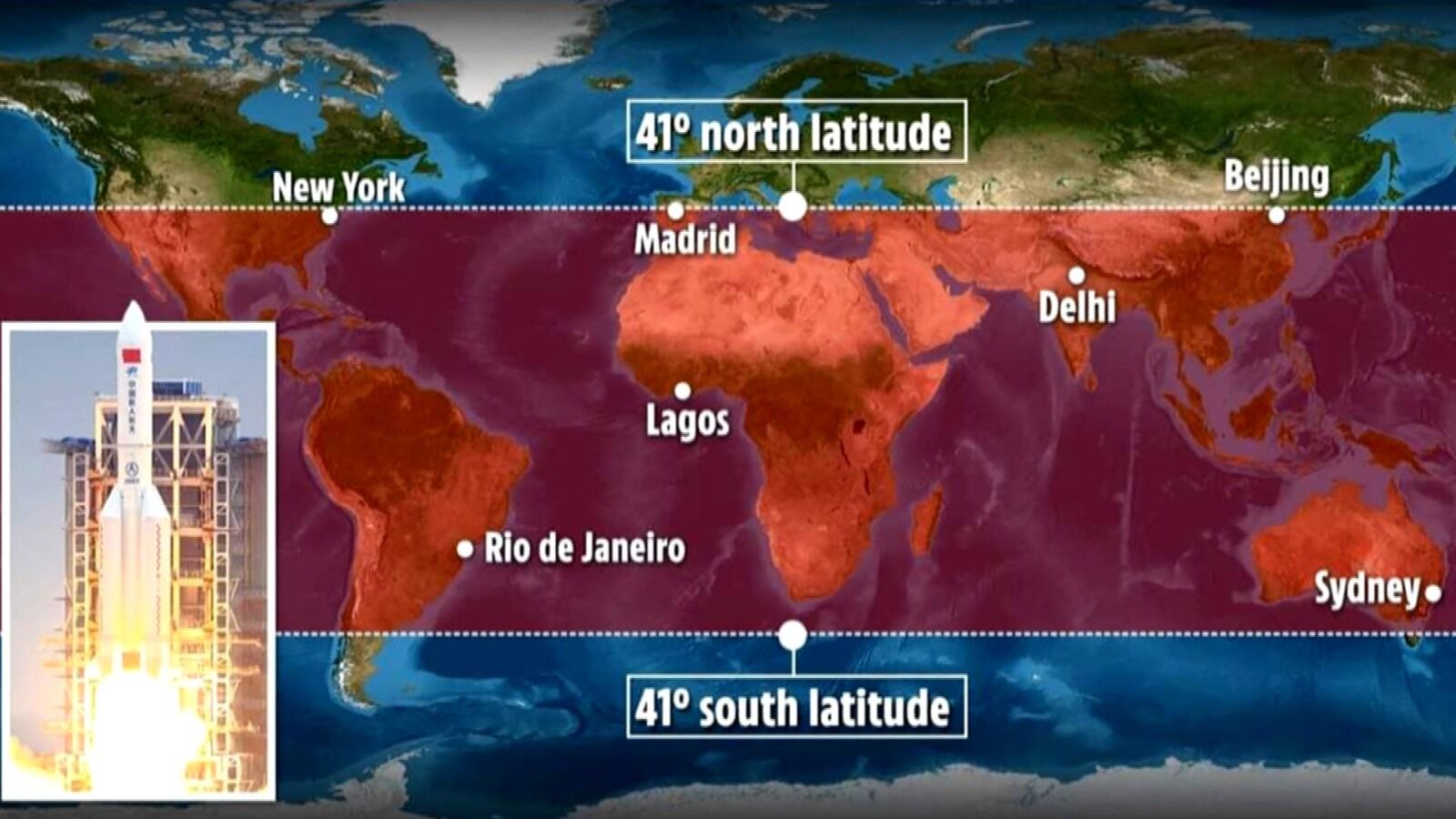 ¿Podría caer en Madrid o en otro punto de España? Lo cierto es que ya sabemos qué países o regiones están incluidos o excluidos para que caiga la basura espacial. Dado que la órbita del CZ-5B está inclinada a unos 41,5 grados con respecto al eje de la Tierra, ya podemos excluir que el aparato caiga más al norte de los 41,5 grados de latitud Norte y más al sur de los 41,5 grados de latitud Sur.