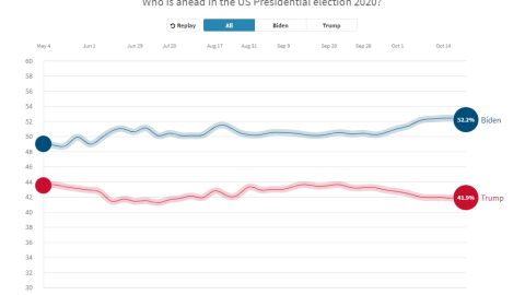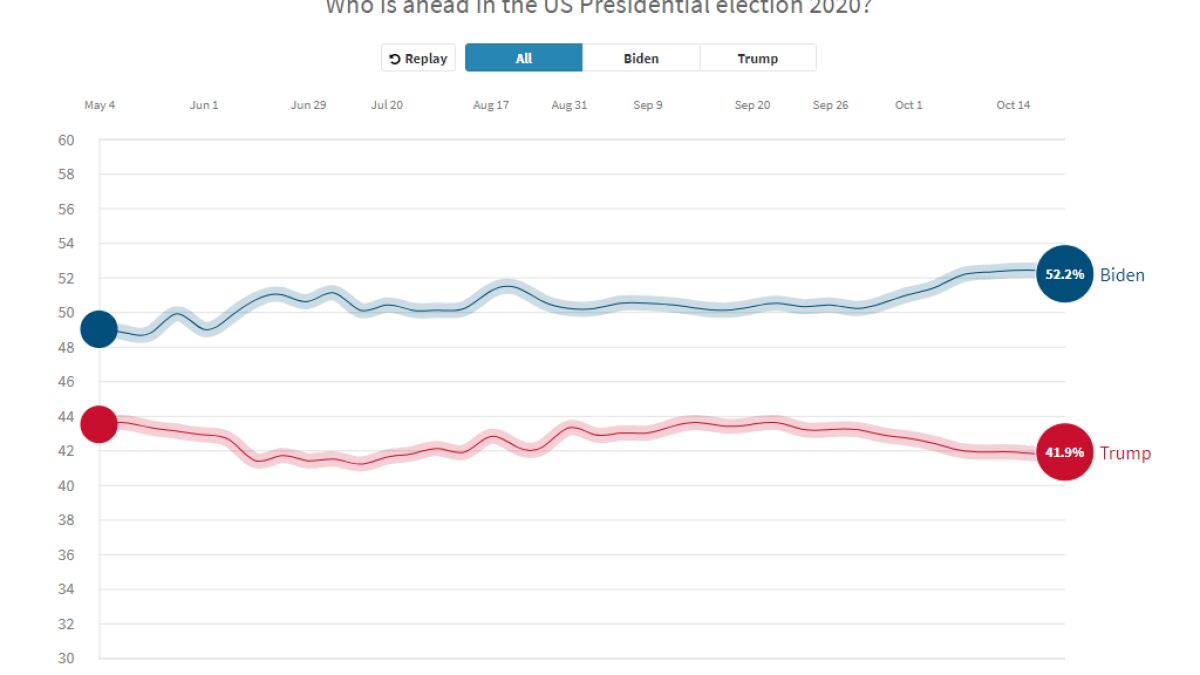 Para ganar la elección presidencial se necesitan 270 votos en el Colegio Electoral. La plataforma fivethirtyeight.com, que hace su propio promedio de encuestas indica que el 53,6 % de los posibles votantes desaprueba la gestión del presidente Trump, mientras que un 43,7 % la aprueba.