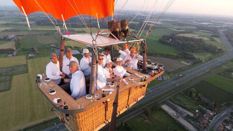 Cenar en el cielo ya es posible. Lo ha conseguido la chef neerladesa Angélique Schmeinck, que ha creado el primer restaurante del mundo en globo aerostático. Se llama CuliAir Skydining y ofrece una experiencia única, que consiste en una cena elaborada por la prestigiosa chef y cocinada en las alturas. El globo, que permite albergar entre 6 y 10 personas, recorre algunos de los paisajes más espectaculares de Países Bajos durante una hora y media, superando los 400 metros de altura y recorriendo hasta 30 kilómetros.