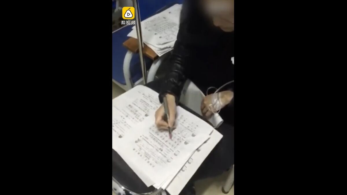 Las imágenes muestran a muestra a la paciente sentada en el pasillo de un hospital de China corrigiendo los ejercicios en una pequeña mesa a pesar de tener un suero intravenoso en su mano izquierda.