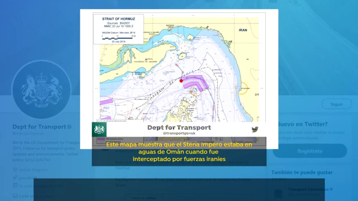 La autoridades del Reino Unido han publicado un mapa en las redes sociales para demostrar que el petrolero británico fue capturado por el ejército iraní en aguas de Omán. Londres denuncia que Teherán ha violado las leyes internacionales, por lo que pretenden incluir sanciones tanto diplomáticas como económicas, e incluso pedir a la ONU y la Unión Europea que reactiven sus sanciones contra Irán. El ministro de Defensa, Tobias Ellwood, asegura que están considerando "una serie de opciones".