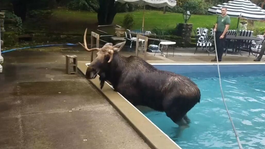 Un alce ha sido rescatado de una piscina familiar en New Hampshire, Estados Unidos. Un grupo de oficiales del Departamento de Pesca y Caza consiguieron sacar al animal de la piscina tras varias horas utilizando unos escalones de madera.