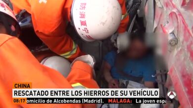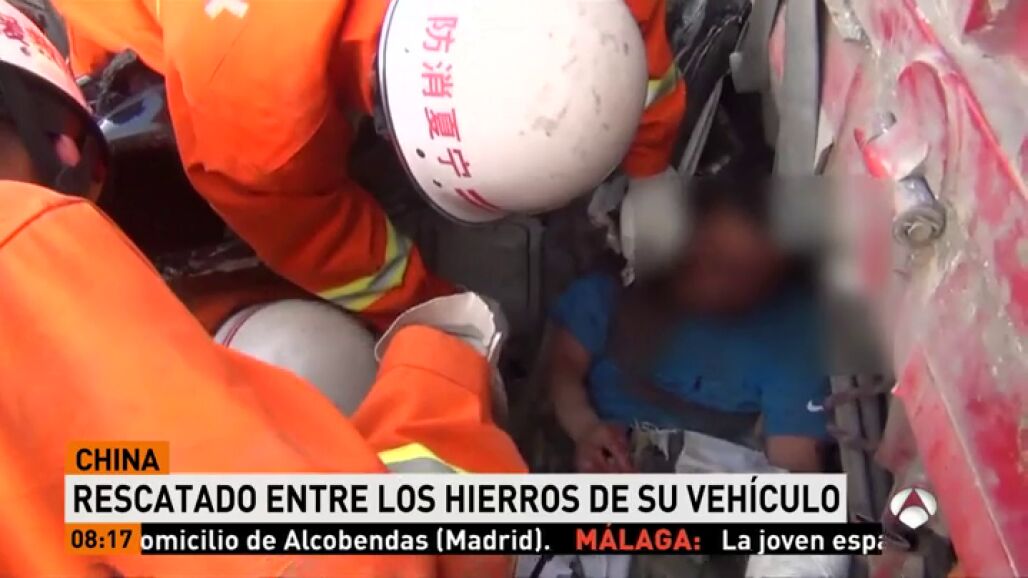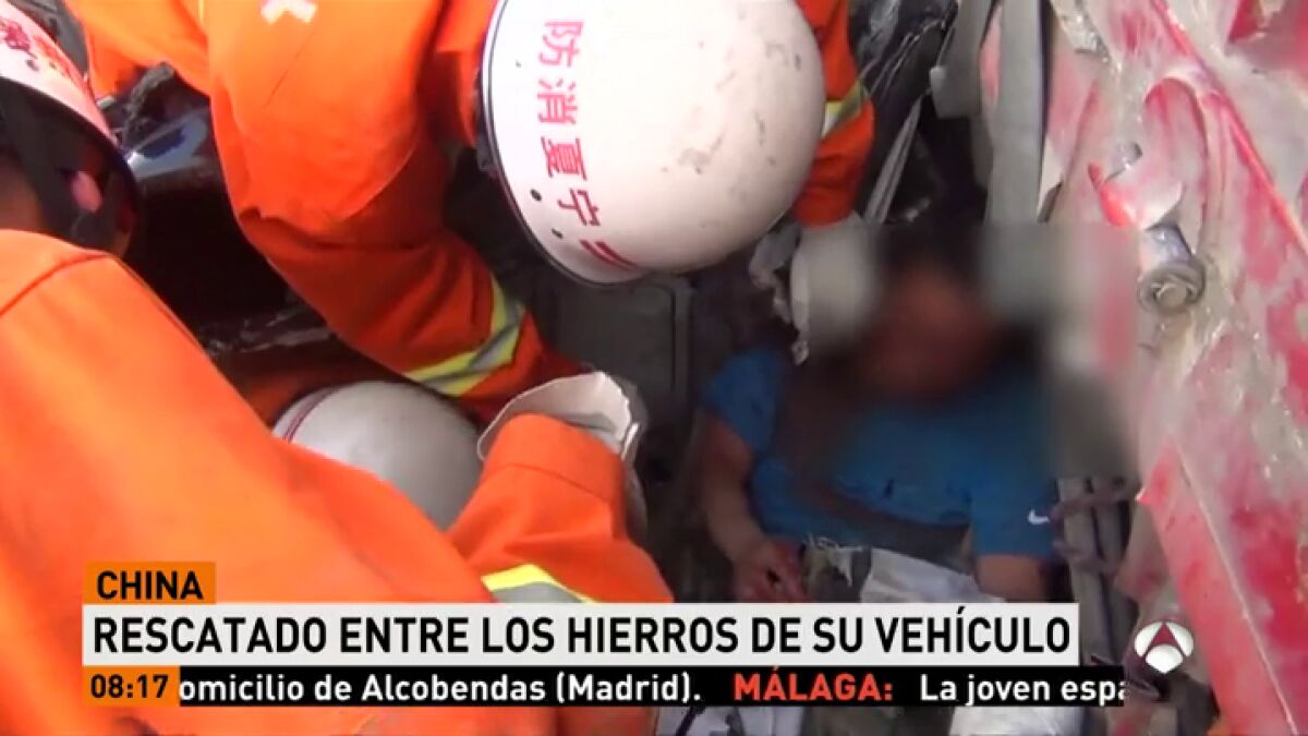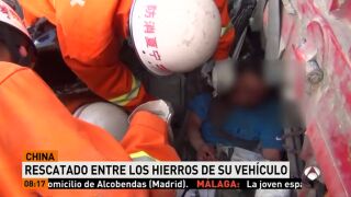 Un hombre queda atrapado en su vehículo después de un aparatoso accidente en China entre dos vehículo y un camión de construcción. Después de varias horas, los bomberos han conseguido rescatarle y trasladarle a un hospital