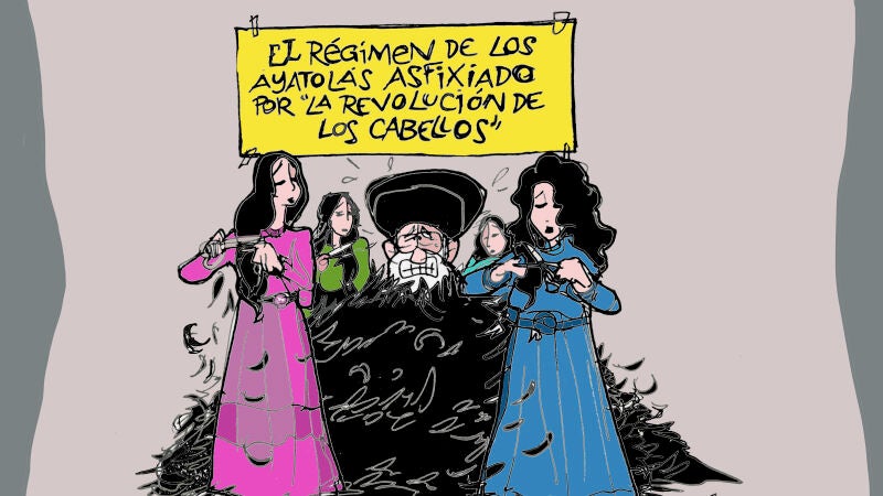 El ilustrador gráfico de Antena 3, Alfredo Boto, se suma a la contrarrevolución que vive Irán tras la muerte de Mahsa Amini y muestra en la viñeta de esta semana a un "régimen de los Ayatolás asfixiado" por la "revolución de los cabellos" . Un movimiento de protesta protagonizado por las mujeres. Cubierto hasta la barba de mechones de pelo se ve al Ayatolá. A su alrededor cuatro mujeres que se cortan el cabello.