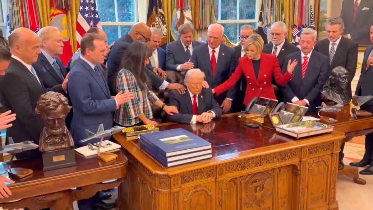 Hay ocasiones en las que una imagen vale más que mil palabras. Y esta, que explicamos a continuación es una de ellas. Nos situamos en el Despacho Oval con Donald Trump en el centro de la imagen sentado detrás de su escritorio. Un grupo de pastores evangélicos posan sus manos sobre el presidente estadounidense mientras rezan por él. Le piden guía y protección. El mandatario, con los ojos cerrados, y expresión complaciente.