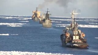 Rusia muestra su músculo militar difundiendo imágenes de buques de guerra atravesando el hielo del Pacífico