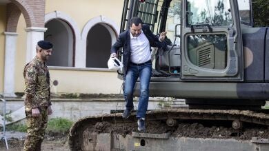 Salvini, líder del partido Liga Norte, se ha subido a la excavadora y ha movido la pala hasta derribar una pequeña porción del tejado del edificio. El trabajo lo terminará el Ejército.