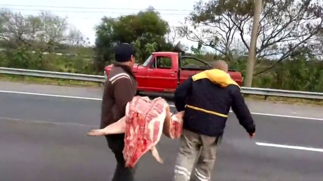 Un camión que transportaba piezas de cerdo perdió una parte de la carga al volcar por el exceso de peso. Las personas que circulaban por la ruta que accede a la ciudad de Santa Fe y vecinos de la zona, saquearon el camión y se llevaron la mercancía en moto, en la parte trasero de las camionetas y algunos arrastraron las piezas. No solo se llevaron la mercancía que se había caído sino también la que estaba dentro del camión.