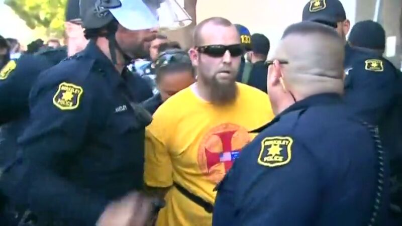 Pese a que las autoridades trataron de separar a ambos bandos se produjeron choques que llevaron al arresto de catorce personas, muchas de ellas por portar máscaras y otros objetos prohibidos para el día de hoy por la Policía de Berkeley.