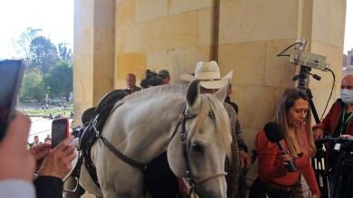 Un senador colombiano ha protagonizado una peculiar estampa para concienciar sobre la labor de los campesinos del país. Alirio Barrera, congresista del Centro Democrático, se ha presentado en el edificio con su caballo blanco y para poder acceder ha alegado que se trata de su "mascota".