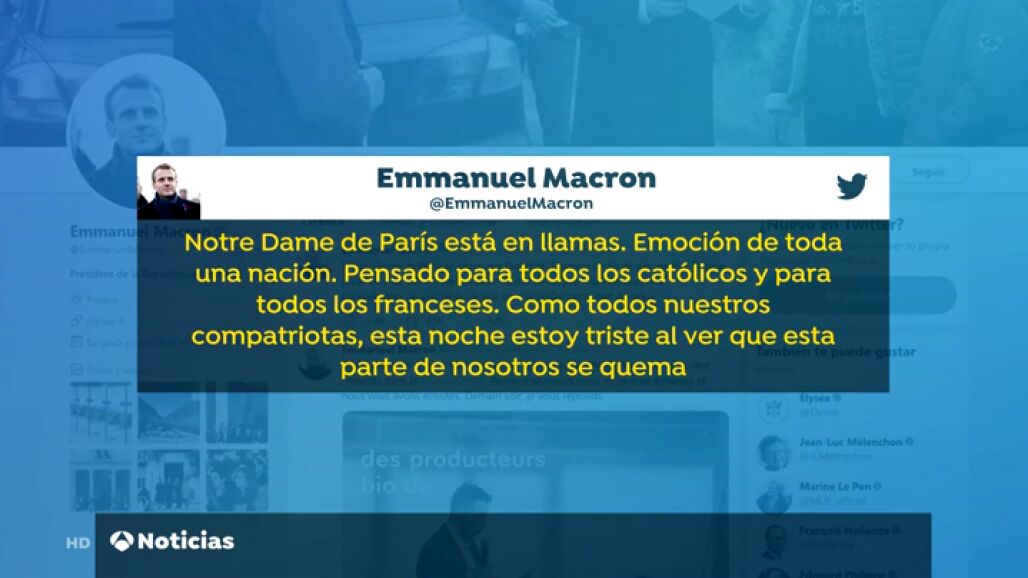 "Nuestra Señora de París en llamas. La emoción de toda una nación. Pensado en todos los católicos y en todos los franceses. Como todos nuestros compatriotas, estoy triste", ha tuiteado.