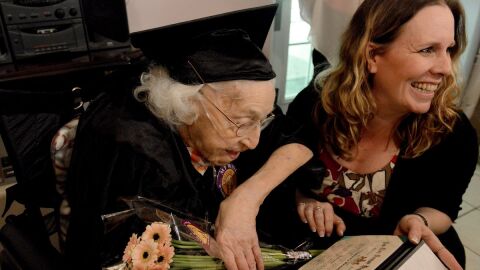 Theresia Brandl celebró el pasado miércoles su graduación de secundaria con toga, birrete y diploma en mano. Fue en el asilo de ancianos Oakdale, donde reside, y estuvo acompañada de sus cuatro nietos, ocho bisnietos y cinco tataranietos. Cuando era joven, tuvo que decidir entre cuidar a su madre enferma o terminar la escuela.