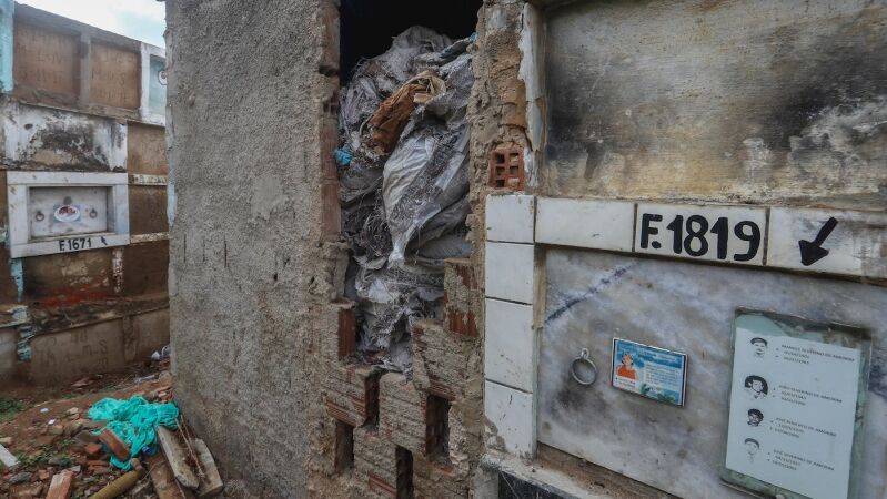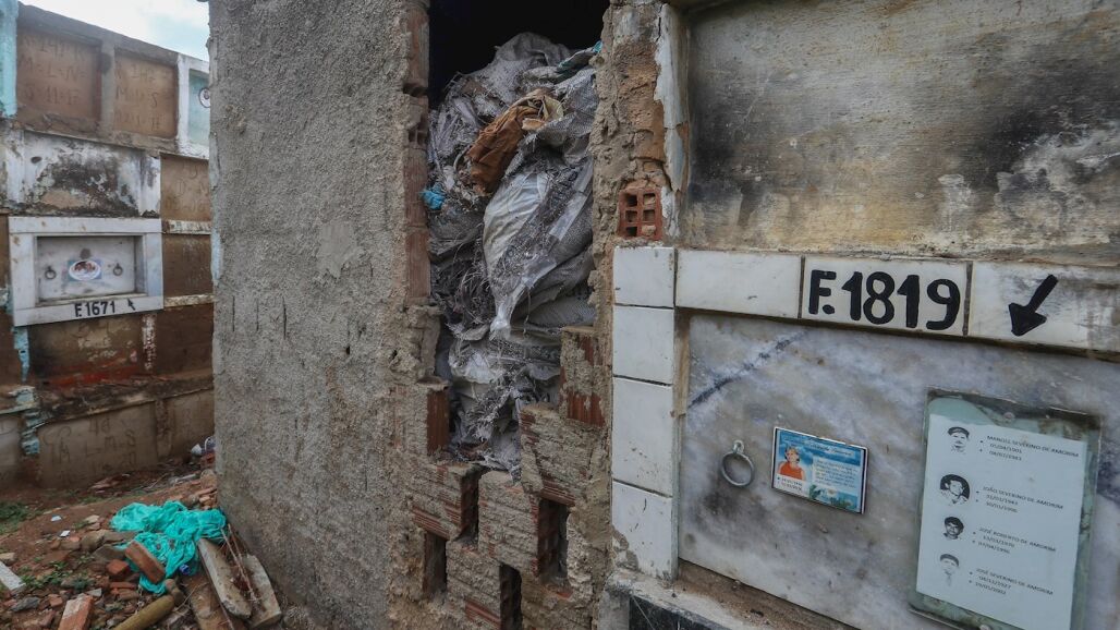 Un escenario de lo más sombrío. Escombros, basura, pedazos de lápidas, panteones que no parecen tumbas y un fuerte olor a restos humanos, a muerte. Una escena que muestra la realidad del caos sanitario del cementerio de Vitoria de Santo Antao, Brasil.