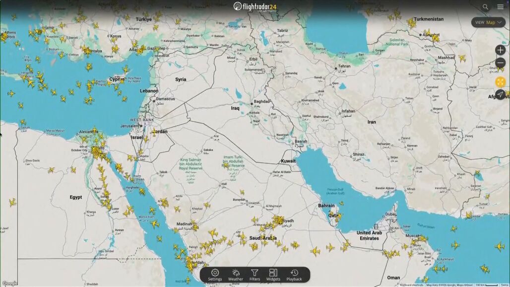 La operación 'Furia Épica' va camino de convertirse en una guerra total en Oriente Próximo y eso se nota ya en el tráfico aéreo y marítimo. La aplicación Flightradar que muestra en directo los aviones que sobrevuelan el espacio aéreo lo deja claro. No hay ningún tráfico en la zona. Todos los vuelos evitan la superficie de Irán y del resto de países del Golfo. El tráfico comercial marítimo también ha disminuido en la zona crítica, en el estrecho de la zona de Ormuz con la suspensión de actividades.