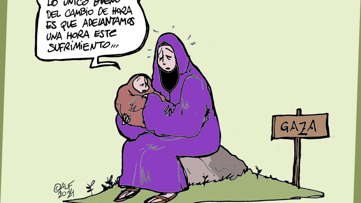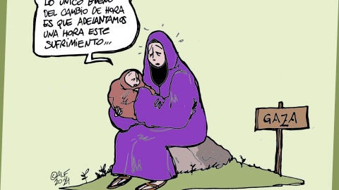 Con visión crítica e irónica, Alfredo Boto refleja el drama que viven miles de gazatíes con la imagen de una madre con su hijo en brazos. La mujer se dirige al pequeño con la siguiente frase: "Lo único bueno del cambio de hora es que adelantamos una hora este sufrimiento..."