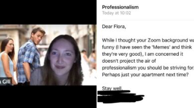 Flora E Gill participó en una videoconferencia de trabajo manteniendo de fondo la imagen de un 'meme'. La joven recibió después un mensaje de su jefe y decidió compartirlo todo en Twitter.