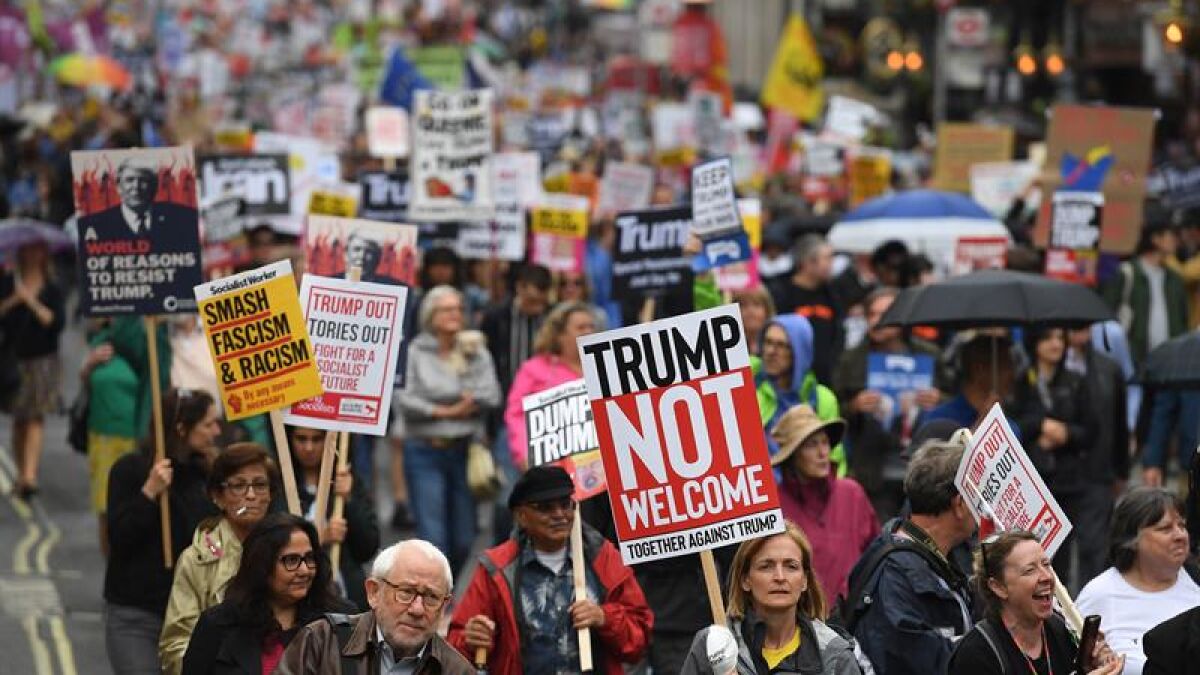 May y Trump han comparecido ante los medios tras una reunión en Downing Street que ha tenido por réplica en las calles una manifestación con miles de personas. Esta marcha, respaldada por líderes opositores como el laborista Jeremy Corbyn, pretendía mostrar la disconformidad de una parte de la ciudadanía con las actuales políticas de la Casa Blanca. "He oído que había protestas, pero (...) no las he visto", ha declarado Trump al ser interrogado al respecto durante la rueda de prensa. "He visto una pequeña protesta cuando venía, muy pequeña, por lo que hay mucho de noticias falsas", ha apostillado el mandatario norteamericano, utilizando el término inglés 'fake news'