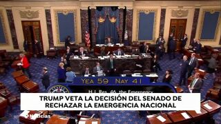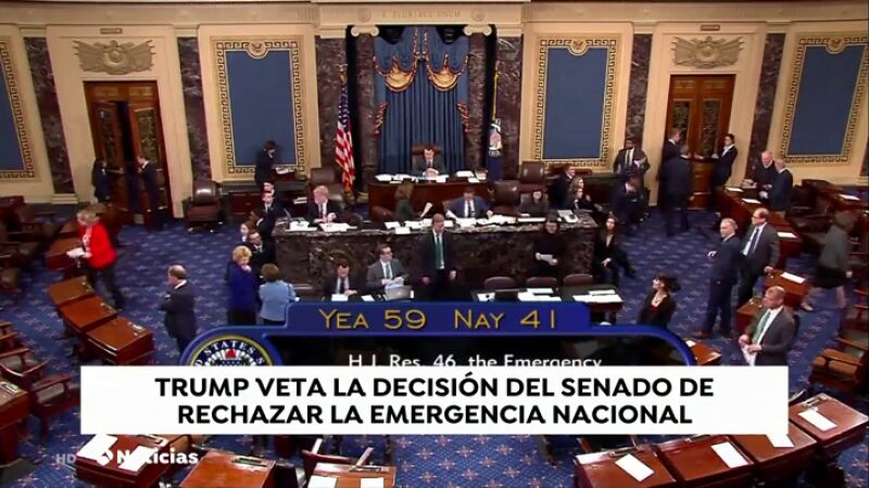 El Senado de Estados Unidos tumba la declaración de "emergencia nacional" de Trump para construir el muro con México. Es el primer revés para Trump, doce senadores de su propio partido, muchos más de los previstos, han desoído al presidente. Trump ya ha anunciado que utilizará por primera vez su derecho a veto para anular esa decisión.