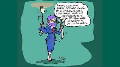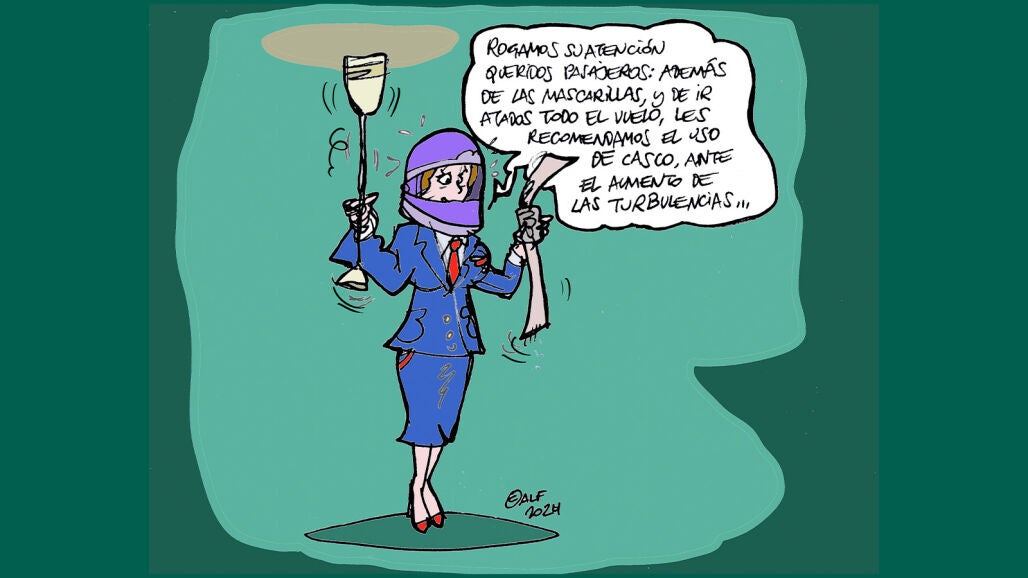"Rogamos su atención queridos pasajeros: además de las mascarillas y de ir atados todo el vuelo, les recomendamos el uso de casco ante el aumento de las turbulencias...", reza el cartel de la viñeta gráfica de esta semana. En ella aparece una azafata de vuelo con un casco, un cinturón de seguridad y una mascarilla.