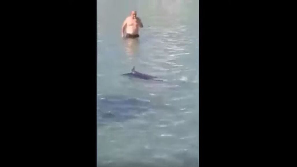 En las imágenes se ve a unos turistas que lanzan piedras al pez espada e incluso se tiran al agua para intentar cogerlo.