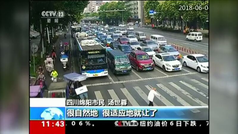 Un anciano dejó bloqueada una carretera de diez carriles mientras cruzaba un paso de cebra. En la grabación se ve cómo el semáforo se pone en verde pero los coches no pueden avanzar. Llega entonces un policía y decide solucionar el problema echando al anciano a cuestas. Al final, consigue llevárselo, con algo de dificultad, para no interrumpir más el tráfico.