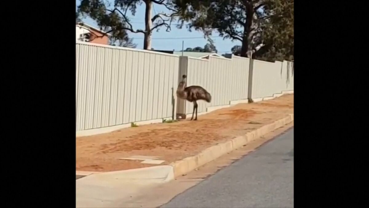 El vídeo, compartido por Reuters, muestra a un joven emú tratando de alimentarse de la pequeña hierba de un pavimento residencial.