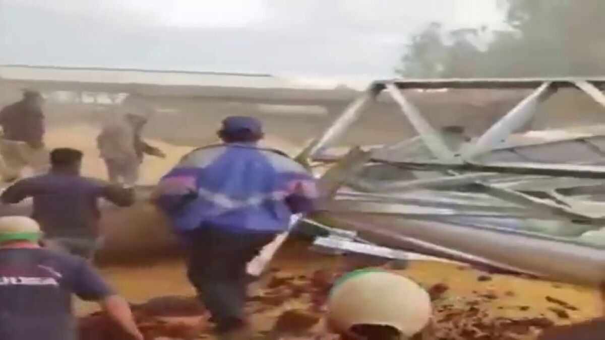 Varios obreros evitan un accidente laboral que podría haber causado víctimas. Durante la jornada laboral, los trabajadores estaban reparando un contenedor que sostenía cien toneladas de granos de soja, hasta que tuvieron que salir corriendo debido a que el contenedor acabó por desmoronarse.